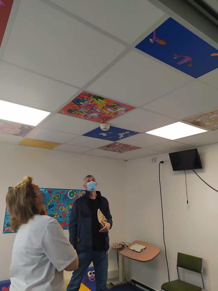 convié à poser dalles au plafond et stickers ludiques aux murs.